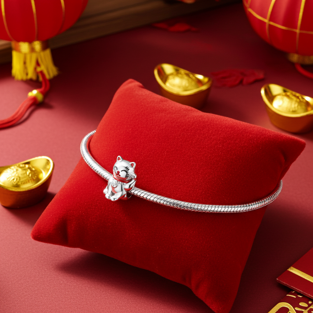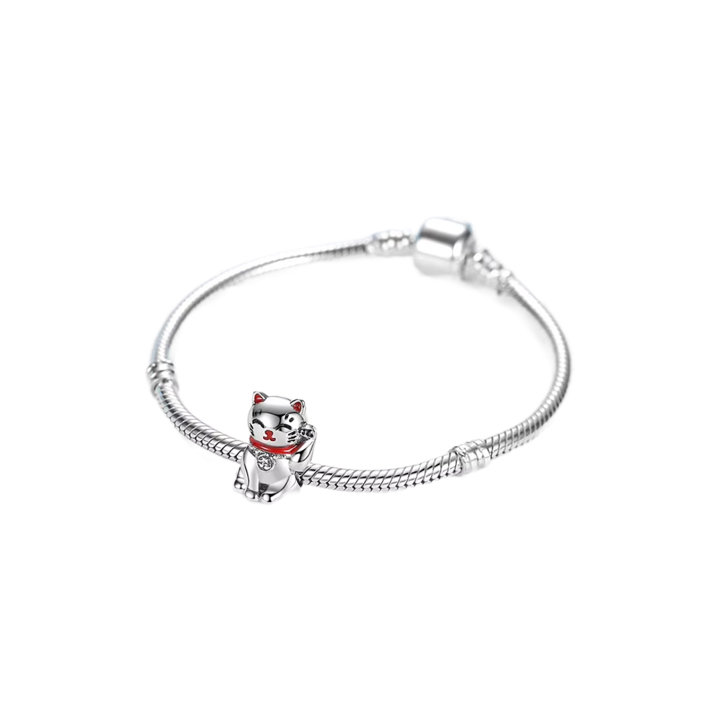 This beautiful and fashionable Bracelet charm features a sterling silver maneki neko lucky cat. Maneki Neko translated from Japanese literally means Beckoning Cat. According to Japanese culture the cat beckons wealth, fortune and luck.