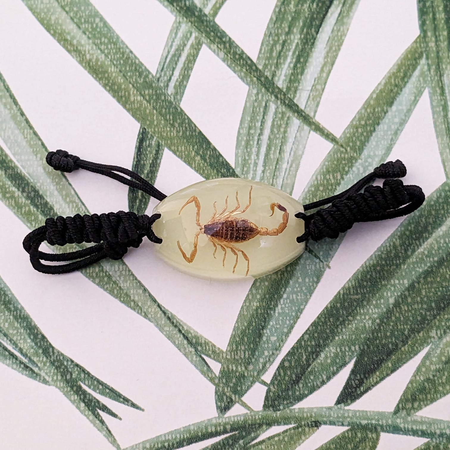 The real scorpion is encapsulated in high quality glow in the dark resin and is attached to a bracelet.